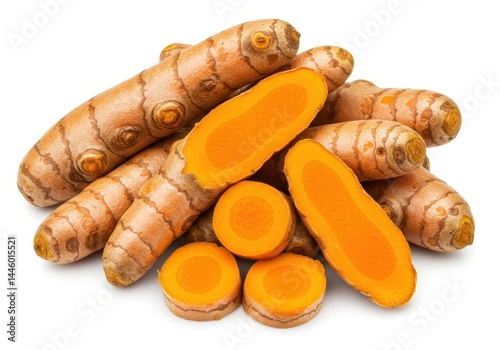 Pile of fresh turmeric roots and slices on a white background, close up