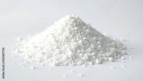 Pile of white granulated sugar on white background, sugar bowl, refined
