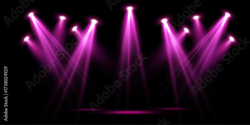 Pink spotlight stage background. Disco party projector light concert or show scene. Magic beam glow for nightclub or award winner with confetti glitter.