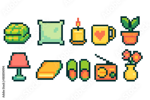 Pixel art icon set home decor, plants, and relaxation. Retro pixel art collection