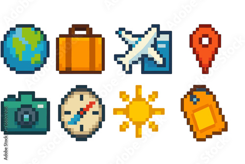 Pixel art travel icon set. explore vacation icons in vibrant pixel style.