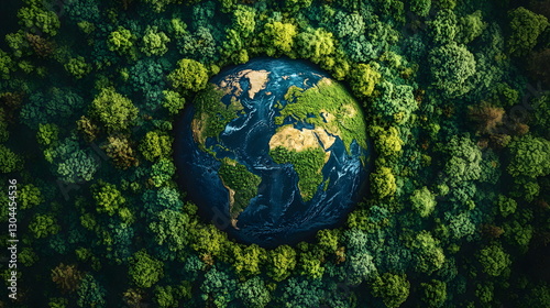 Planet earth surrounded by green forests. Save the world, creativity, pollution or world earth day concept. Top view