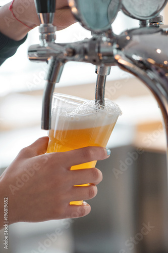 plastic cup of beer flowing from beer tap with nice foam close-up in female bartender hands on blurred background