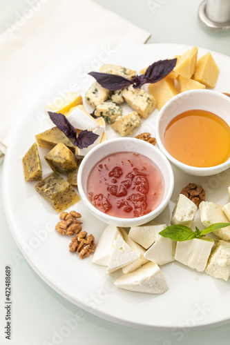 Plate with assorted cheeses and honey