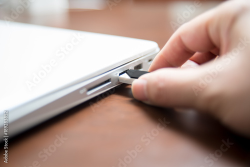 Plugging in and unplugging the USB flash memory to the laptop pc computer.