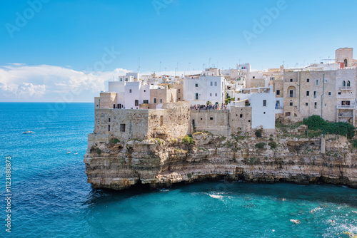 Polignano a Mare Vibrant white buildings cling to rugged cliffs, overlooking serene turquoise waters. Visitors enjoy the stunning coastal views in beautiful Puglia, Italy