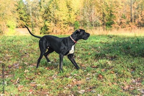 Portrait of a beautiful black Great Dane dog in an autumn field