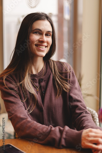 Portrait of a beautiful smiling woman with long dark hair looking at camera, wearing a casual burgundy cardigan, sitting at a wooden table in a cafe, natural indoor lighting, cheerful girl in shop.