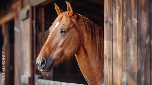 Portrait of a beautiful sorrel horse standing in a wooden stall in the stable. Agriculture and horse care. Livestock on the farm.