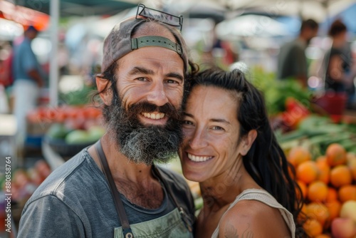 Portrait of a blissful multiethnic couple in their 30s sporting a technical climbing shirt over vibrant farmers market