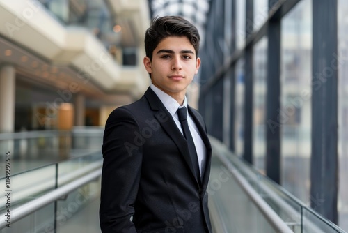 Portrait of a confident young businessman wearing a suit standing in the corridor of a modern office building