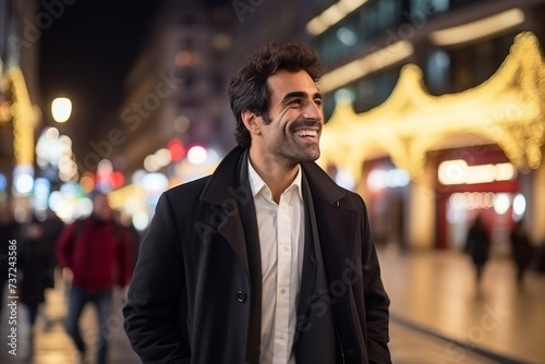 Portrait of a handsome man walking in the city at night.