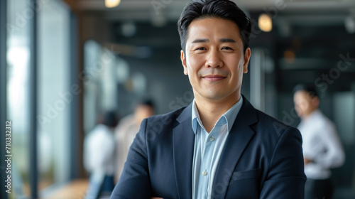 Portrait of a handsome smiling asian businessman boss standing in his modern business company office.