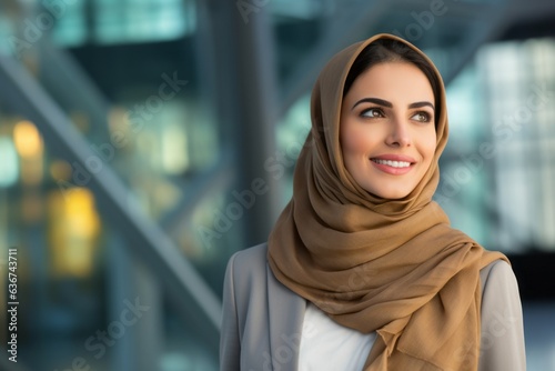 Portrait of a Saudi Arabian woman in her 30s in a modern architectural background wearing a foulard