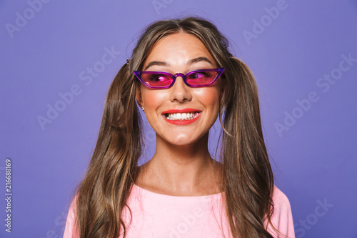 Portrait of a smiling girl in sweatshirt in sunglasses