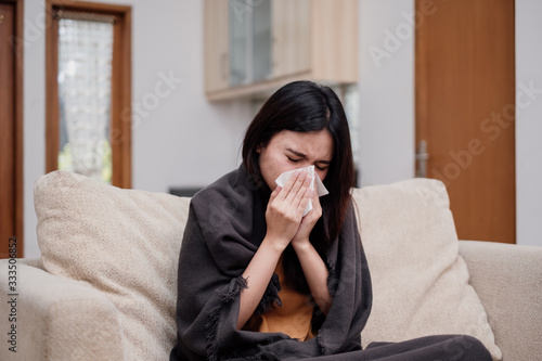 Portrait of a sneezing and sick flu young woman asian at home. Pandemic 2019 Coronavirus 2019-nCoV Concept.