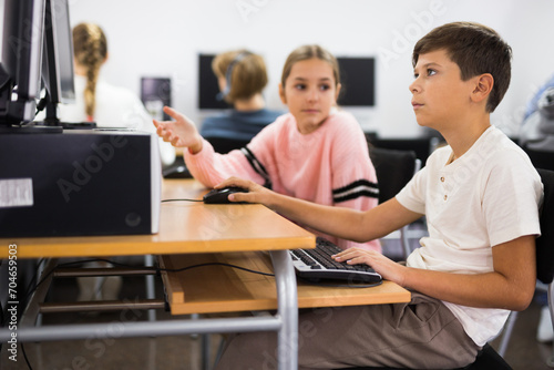 Portrait of a ten-year-old schoolboy studying at a computer in the classroom at a informatics lesson with classmates