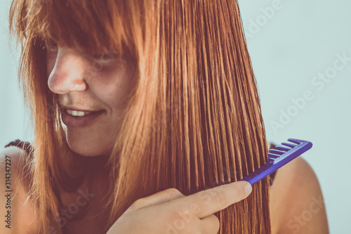 Portrait of a young red haired woman brushing or combing her long hair with a blue or purple comb. Strands of hair are clearly seen.