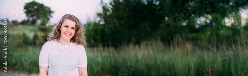 Portrait Of Beautiful Plus Size Young Woman In White Shirt Posing In Summer Field Meadow At Sunset Background