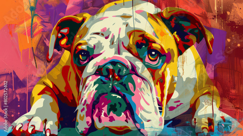 Portrait of english bulldog dog in colorful pop art comic style painting illustration.