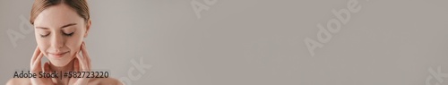 Portrait of freckled redhead woman touching face against grey background