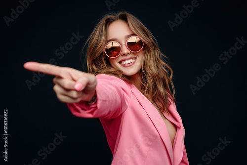 Portrait of happy confident young woman in stylish party outfit. Positive beautiful mexican American lady wearing fashionable pink suit and cool sunglasses looking at camera, smiling and pointing at y