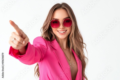 Portrait of happy confident young woman in stylish party outfit. Positive beautiful scandinavian lady wearing fashionable pink suit and cool sunglasses looking at camera, smiling and pointing at you w
