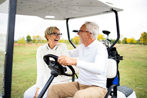 Portrait of healthy smiling senior couple driving golf car and heading to the green zone.