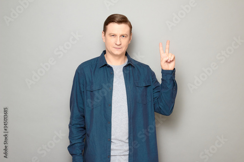 Portrait of man showing victory gesture or number two and smiling