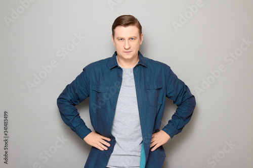 Portrait of serious focused man holding hands on hips