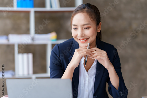 Portrait of smiling Asian businesswoman enjoying work ideas sitting on a laptop at the office.