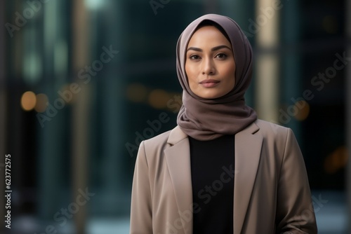 portrait of young muslim businesswoman wearing beige coat and hijab