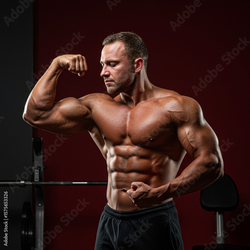 Powerful bodybuilder flexing biceps in a gym against a vibrant red backdrop.