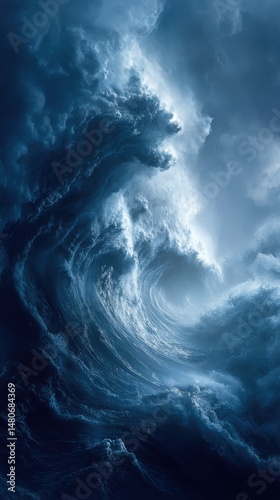 Powerful ocean wave crashing in a dramatic seascape view from below with moody blue tones and dynamic water movement