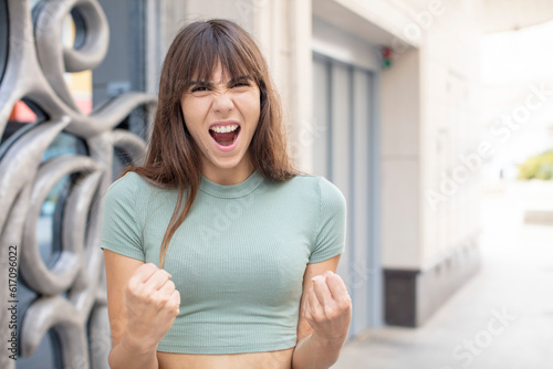 pretty young woman shouting aggressively with annoyed, frustrated, angry look and tight fists, feeling furious