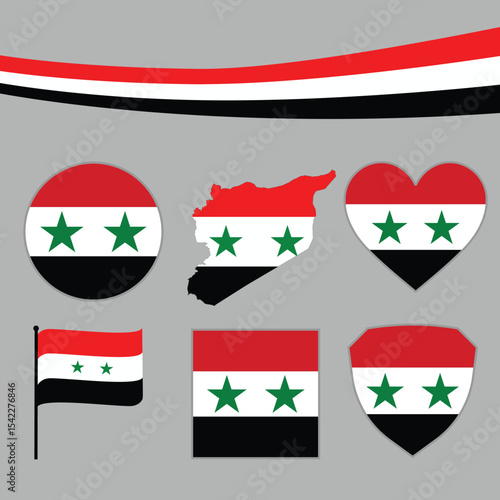 Print Syria map with national ribbon and 5 styles of flags – heart, circle, flat, wave, and badge – creative vector design for education, presentations, and patriotic projects