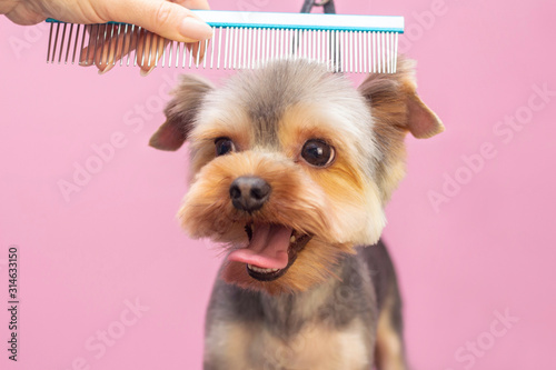 Professional cares for a dog in a specialized salon. Groomers holding tools at the hands. Pink background. groomer concept