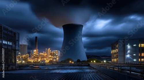 Professional Rooftop Photography of Industrial Cooling Tower with Metal Pipes, Ventilation System, Urban Skyline, Clear Sky, and High-Resolution Architectural Details, 32k Resolution
