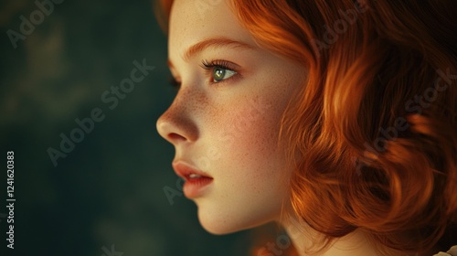 Profile of a thoughtful young girl with vibrant red curly hair and freckles gazing contemplatively against a soft blue-green background.