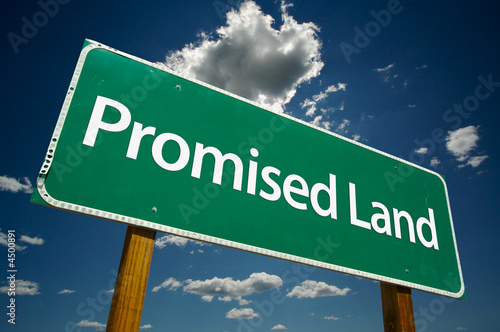 "Promised Land" Road Sign with dramatic clouds and sky.