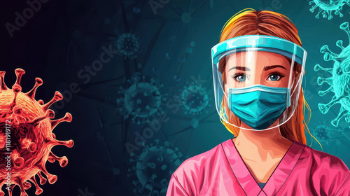Protective gear, masked girl, virus defense, healthcare worker, pandemic response, safety measures, medical illustration