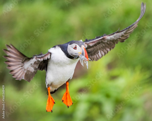 puffin bird in flight with fish in beak