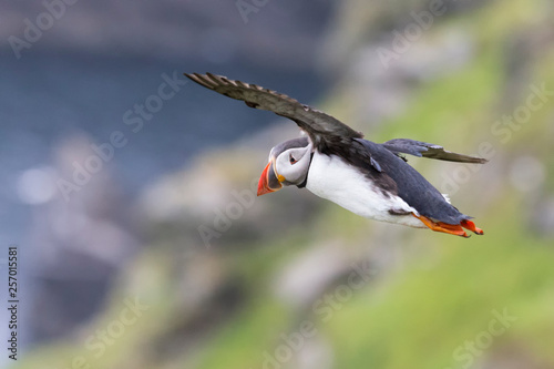 Puffin in flight to catch fish on Shetland Island with strong winds