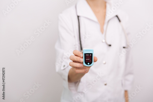 Pulse oximeter with hand of doctor isolated on white. The concept of portable digital device to measure person's oxygen saturation. Measuring oxygen saturation, pulse rate and oxygen levels