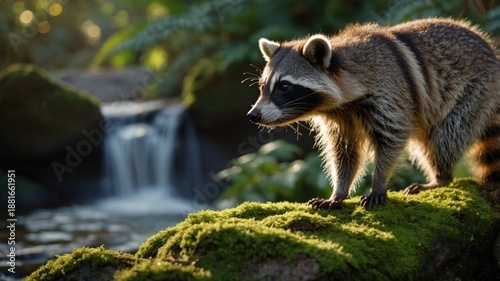 Raccoon perched on a mossy log near a serene waterfall in a lush forest, showcasing nature's beauty
