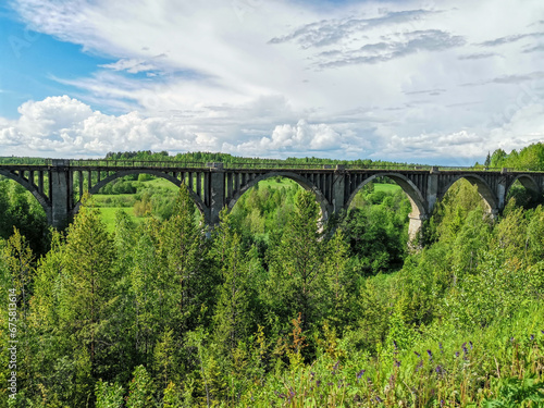 Railway bridge across the river in the south of the Kama region. The old Big Sars viaduct. The abandoned Oktyabrsky viaduct in the Perm Region. Russia.