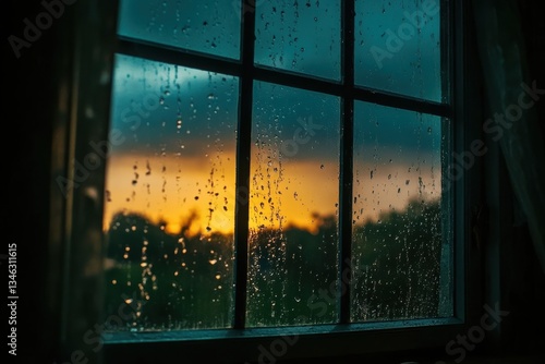 Rain-kissed window reveals a vibrant sunset over lush greenery at dusk