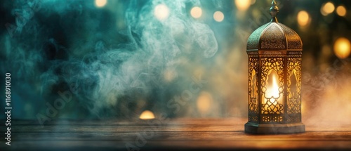 Ramadan Kareem greeting card design. Arabic Lantern glowing at night on table with smoke.