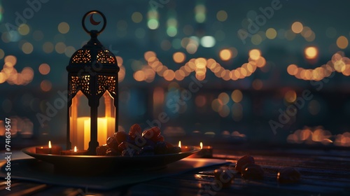 Ramadan Kareem. Ramadan Kareem greeting card. Arabic lantern with dates on the table.