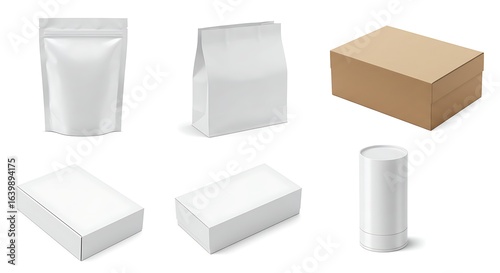 Realistic 3D collection of blank packaging templates. Includes white stand-up pouch, paper bag, cardboard boxes, and a tube container mockup.